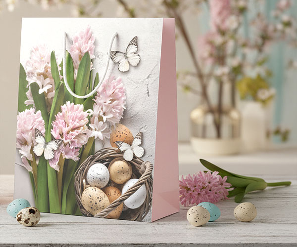 Geschenktaschen gehören zu den unkompliziertesten und margenstärksten Verpackungslösungen im Ostergeschäft. Sie sind sofort einsatzbereit, verursachen keinen Konfektionierungsaufwand und eignen sich ideal für Flaschen, Süßwaren oder kleinere Geschenkartikel. Motive mit Häschen (Geschenktasche „Häschen mit Korb“, „Osterhäschen“) oder floralen Elementen (Geschenktasche „Blütenmeer“, „Osterblümchen“) sowie frische Farben wie Limette und Gelb (Papiertüte „Aspekt“ in Grün, „Aspekt“ in Gelb) entsprechen den aktuellen Trends und setzen gezielte Akzente im Verkaufsraum. Ergänzt durch Dekoklammern oder Grußkärtchen entsteht mit minimalem Aufwand ein attraktives Zusatzangebot, das Impulskäufe fördert und das Saisonergebnis positiv beeinflusst.